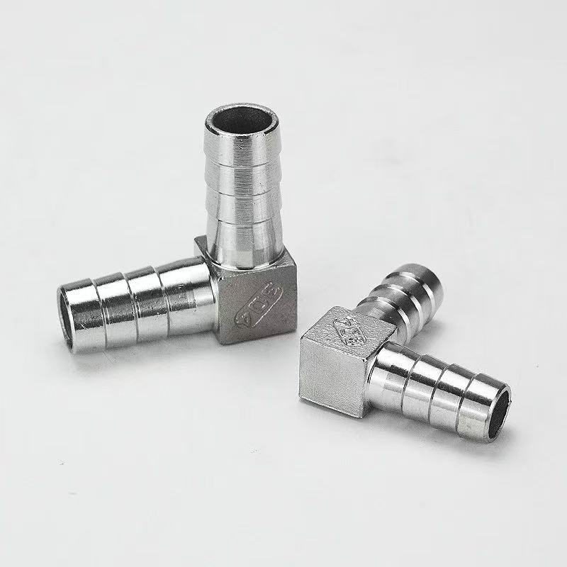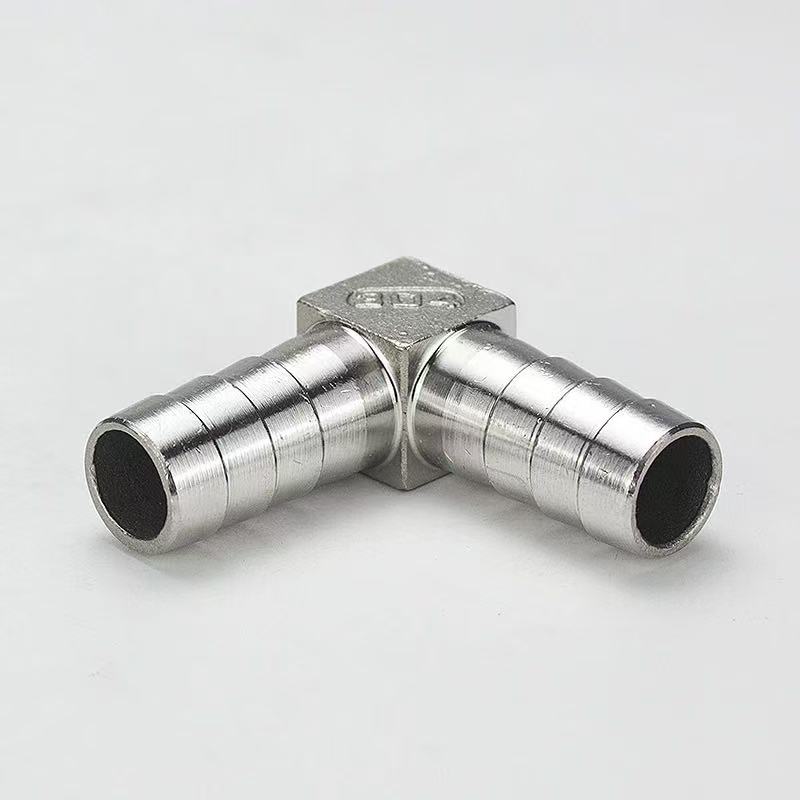 موصل أنابيب المياه باغودا من النوع L: يتميز كلا الطرفين بهيكل باغودا شائك، مصمم لإنشاء اتصال اتجاهي 90 درجة بين خرطومين مرنين.